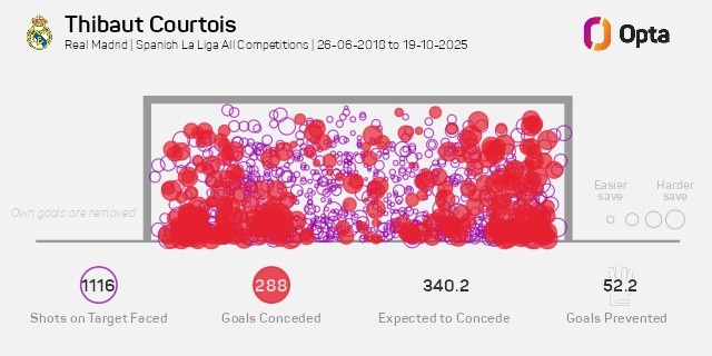 Opta指出,2018-2019赛季库尔图瓦加盟皇马以来,预期失球340.2粒,而去掉乌龙球的骨子失球为288粒,这意味着库尔图瓦防碍了52.2粒失球,五大联赛门将同时最多。