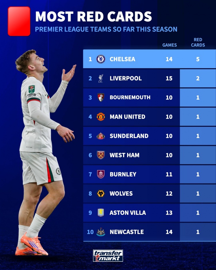 本赛季英超球队各项赛事红牌:切尔西5红遥遥跨越,利物浦2红第二