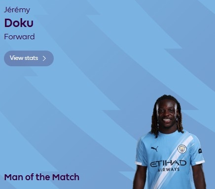 11月10日讯 2025-26赛季英超第11轮焦点战,曼城3-0利物浦,赛后,多库当选英超官方评比的全场最好球员。