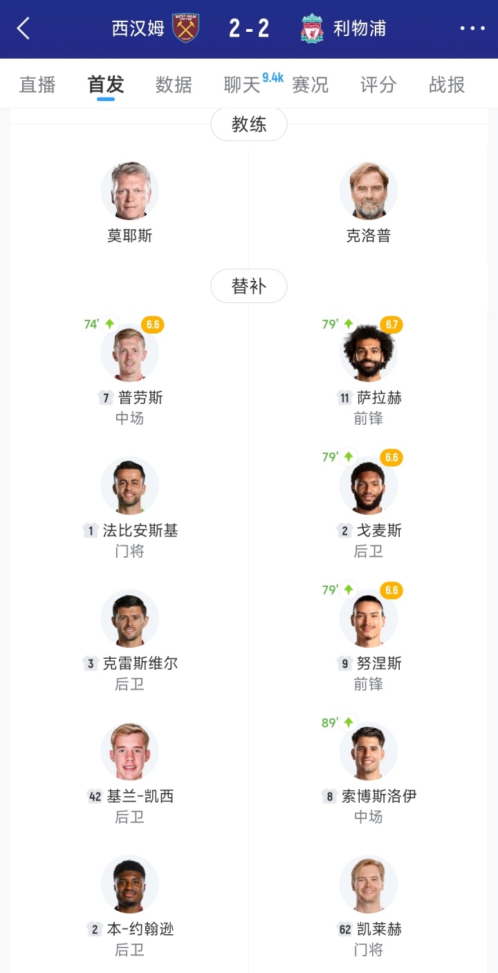 萨拉赫上一次在英超比赛中替补,也曾2024年4月27日利物浦2-2战平西汉姆联,当时利物浦也曾克洛普抓教,萨拉赫下半场比赛替补登场。而后53场英超联赛,萨拉赫沿路首发。