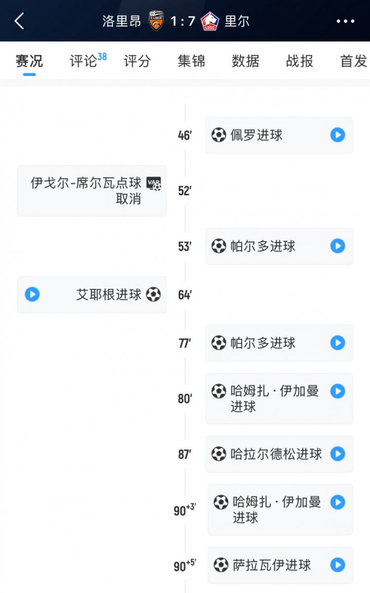 7-1客胜洛里昂&下半场打入一起7球,里尔是法甲自1997年来首队