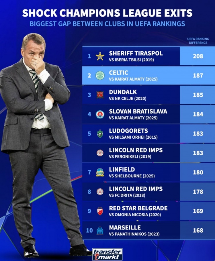 8月28日讯 欧冠附加赛次回合,凯尔特东说念主在点球大战中不敌阿拉木图凯拉特,目送敌手队史初度闯进欧冠正赛。左证德国转会商场的统计,凯尔特东说念主本次被淘汰是欧冠历史交锋两队欧足联积分排名第二大。