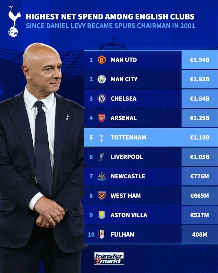列维01年入主热刺于今转会净支拨11亿欧,同时英格兰球队第五