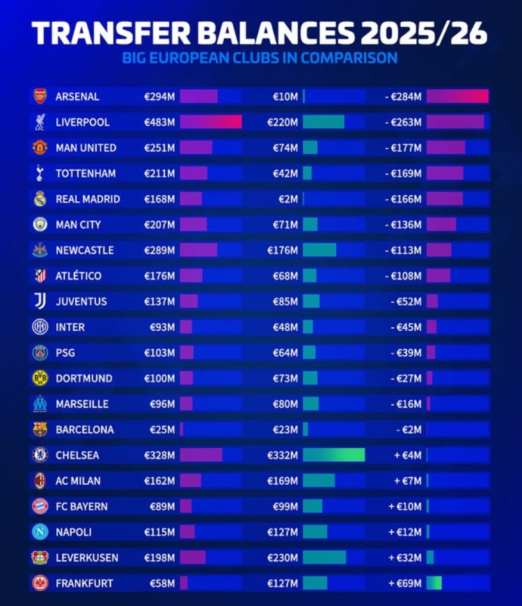 9月5日讯 今夏转会市集卓越火热,《转会市集》也统计了20支欧洲球队的支拨、收入及盈亏情况。