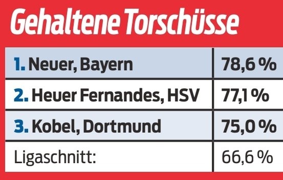 10月8日讯 《体育图片报》统计了本赛季门将在德甲联赛中的扑救得胜率,比肩出前三名榜单,拜仁39岁门将诺伊尔以78.6%居首。