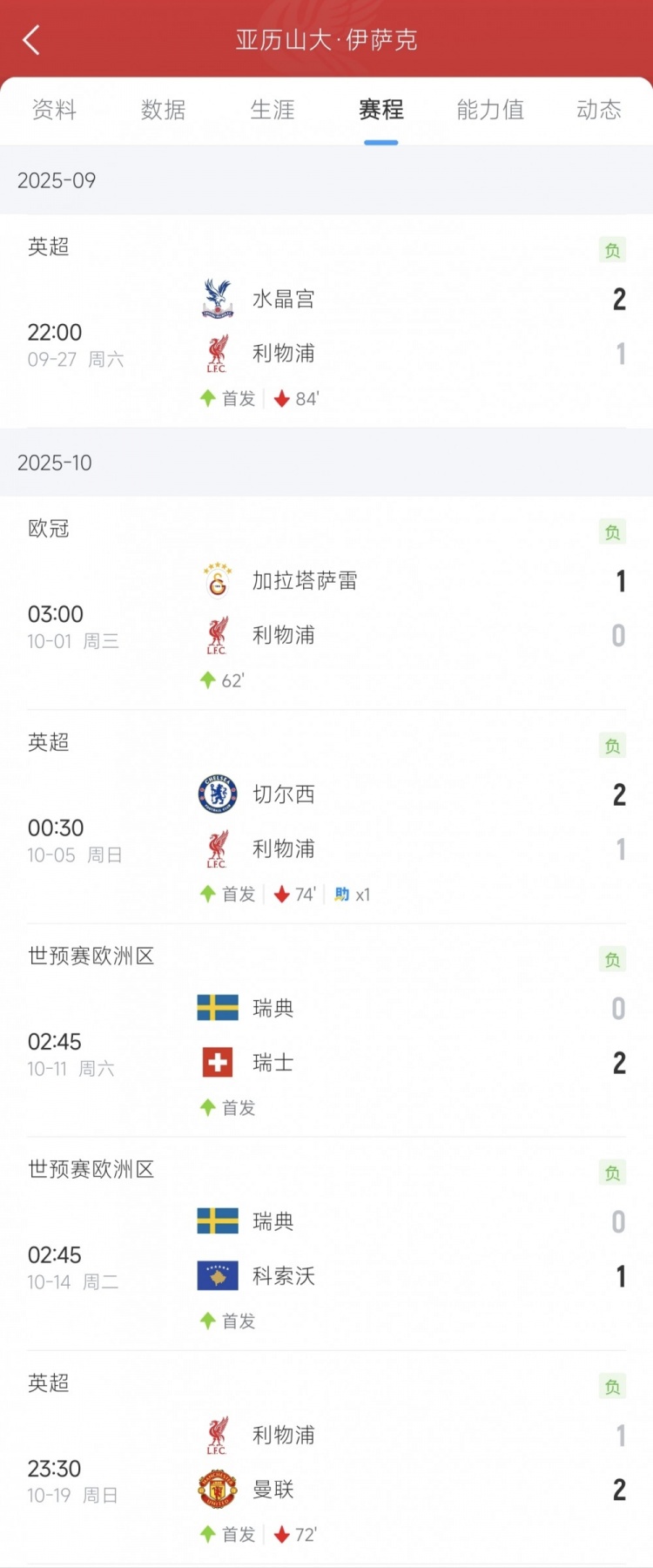 利物浦遭逢4连败,而伊萨克本东说念主则遭逢各项赛事6连败!其中英超不敌水晶宫、切尔西、曼联,欧冠客负加拉塔萨雷,世初赛代表瑞典队不敌瑞士和科索沃。时代,伊萨克6场比赛仅在对阵切尔西的比赛中孝顺1次助攻。