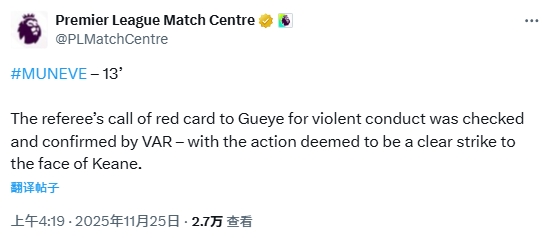 英超官方给出讲解:“主裁判认定盖耶握行暴力行为并出示红牌的判罚,经VAR时刻核查说明,该算作被判定为对基恩面部的明显击打算作。”