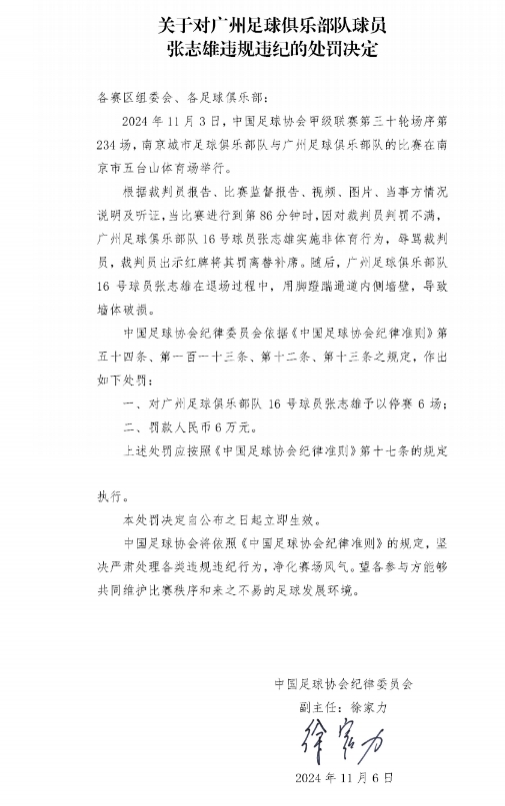 而在这个赛季的收官战中,张志雄再次引起事端。由于对判罚动怒,张志雄作念出是曲裁判的行径,并在退场历程中蹬踹通说念墙体,过后被中国足协处治停赛6场并罚金6万元东说念主民币。