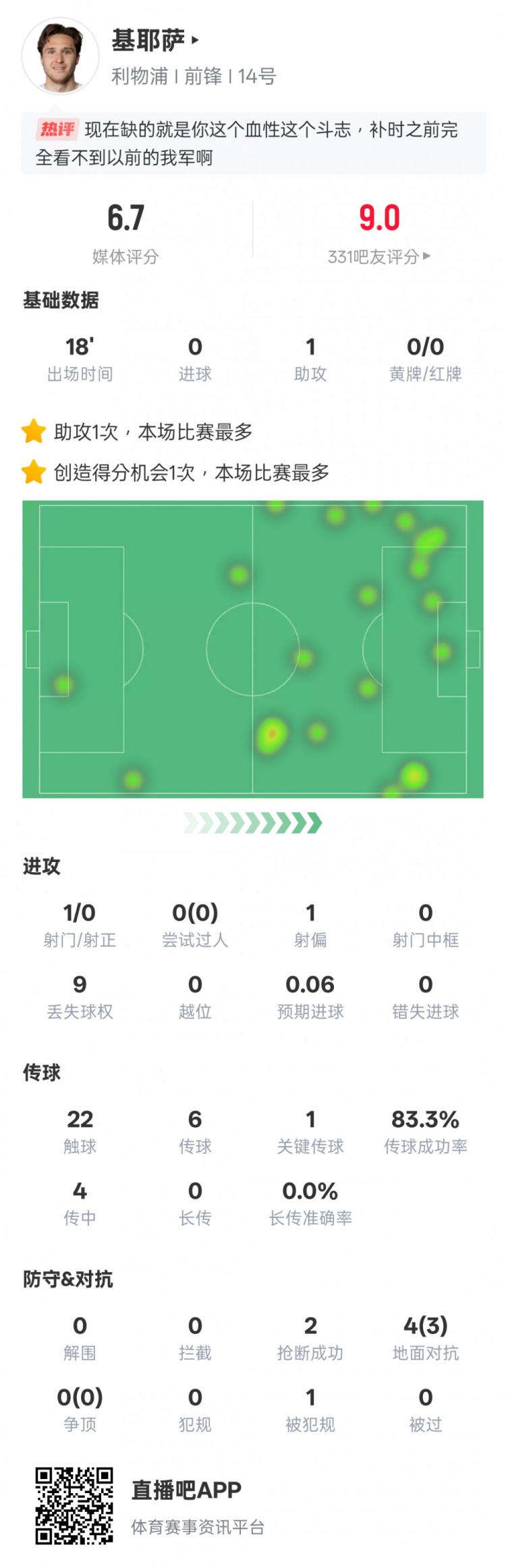 小基耶萨本场数据:替补出战1助攻1关节传球2抢断,评分6.7