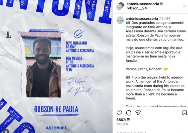 10月31日讯经纪公司Antoniu’s Assessoria本日官方晓示,前大连英博外助罗伯森加盟,成为该公司旗下牙东说念主。