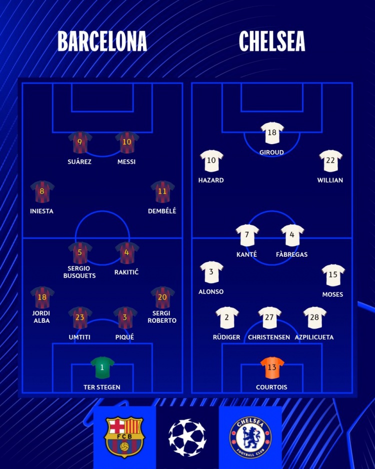 特尔施特根;阿尔巴、乌姆蒂蒂、皮克、罗贝托;布斯克茨、拉基蒂奇、伊涅斯塔、登贝莱;苏亚雷斯、梅西
