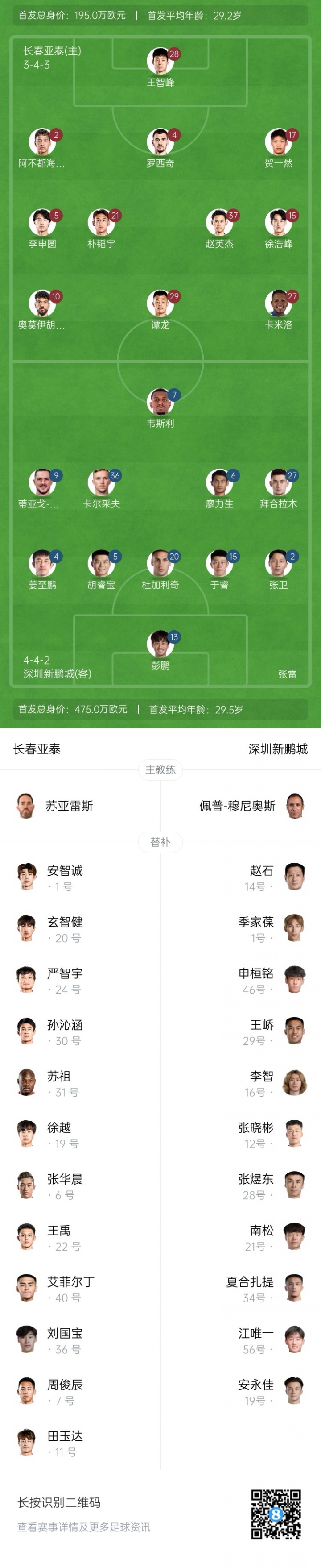 长春亚泰首发:28-王智峰、2-阿不齐海米提-阿不齐格尼、4-罗西奇(F)、5-李申圆、15-徐浩峰、17-贺一然、21-朴韬宇、37-赵强者、10-奥莫伊胡安弗(F)、27-胡安-卡米洛(F)、29-谭龙