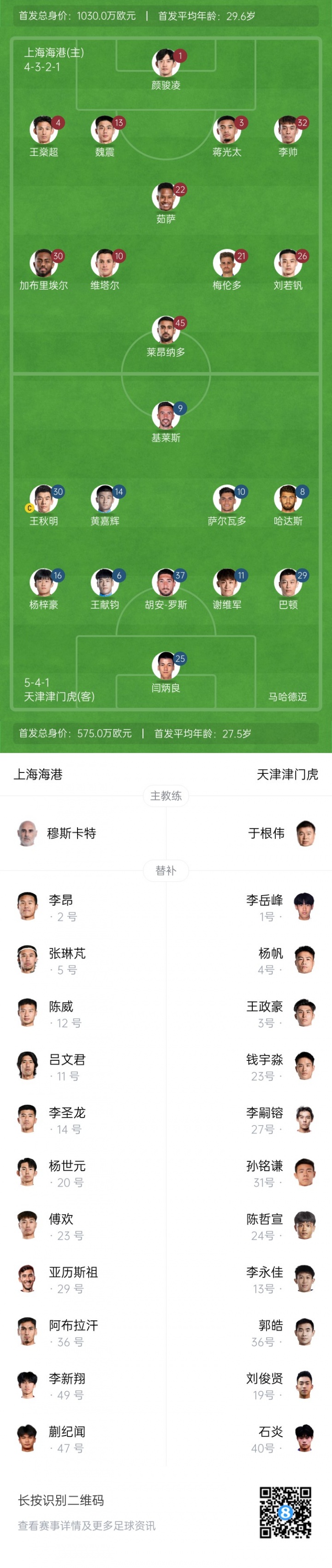 上海海港首发:1-颜骏凌、3-蒋光太、4-王燊超、13-魏震、32-李帅、10-马特乌斯-维塔尔(F)、21-梅伦多(F)、22-马修斯-茹萨(F)、26-刘若钒、30-加布里埃尔(F)、45-莱昂纳多(F)