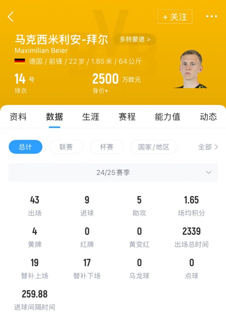拜尔现年22岁,现在德回身价2500万欧。多特于客岁夏天破耗2850万欧从霍芬海姆将拜尔引进。上赛季拜尔各项赛事43场9球5助。