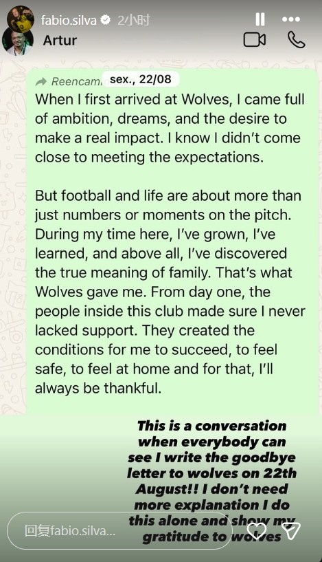 法比奥-席尔瓦写谈:每个东谈主齐不错看到,这是我8月22日写下致狼队告别信时的一段对话。关于我方是否落寞完成告别信,我莫得必要进行过多确认,我通过翰墨抒发了对狼队的谢意之情。