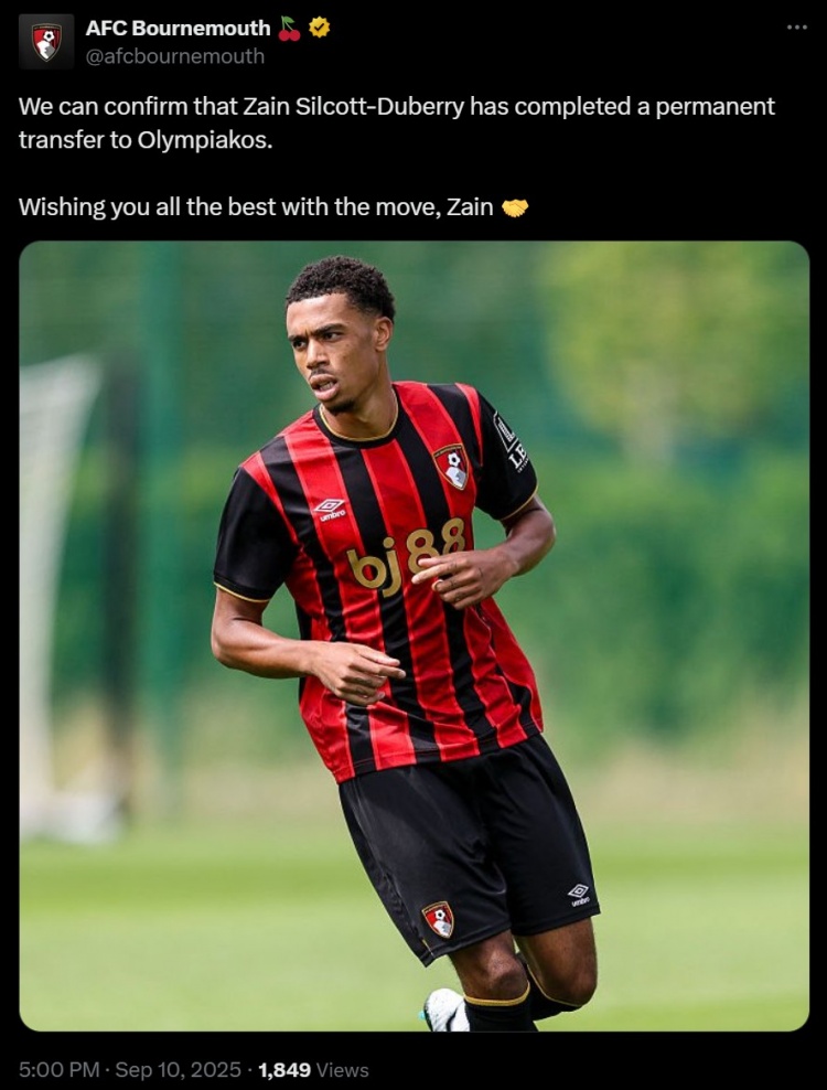 官方:伯恩茅斯20岁边锋杜伯里恒久转会至奥林匹亚科斯