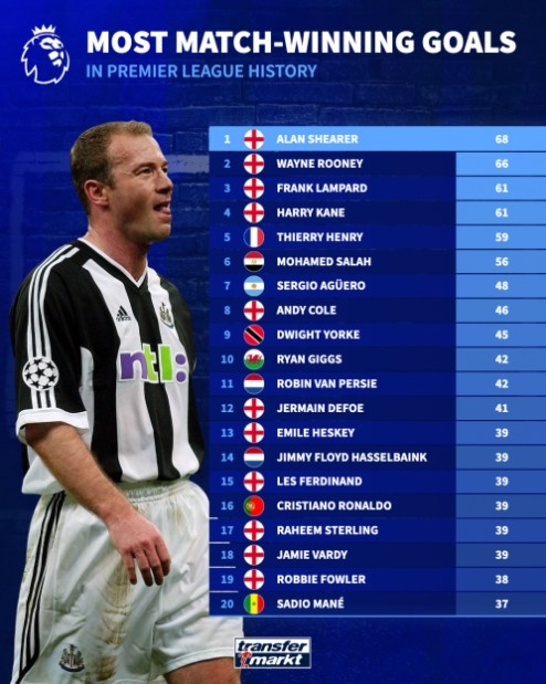 英超历史打进制胜球球员排名:希勒68球居首,鲁尼66球位居次席