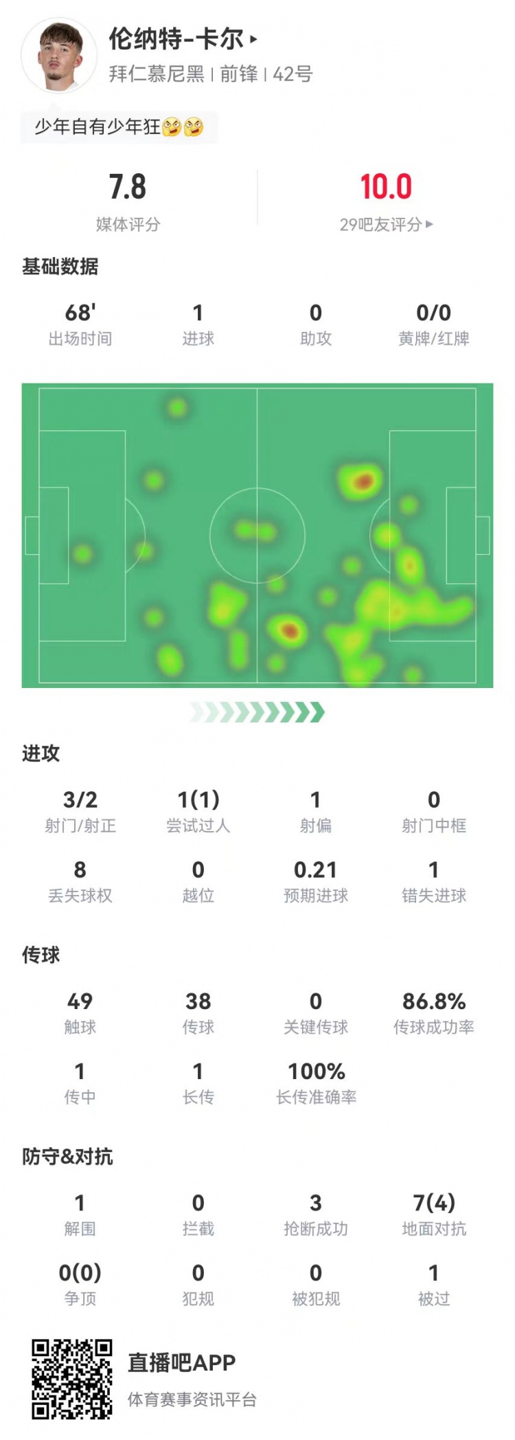 10月23日讯 拜仁在本轮欧冠3-0跳动布鲁日,小将伦纳特-卡尔本场数据如下: