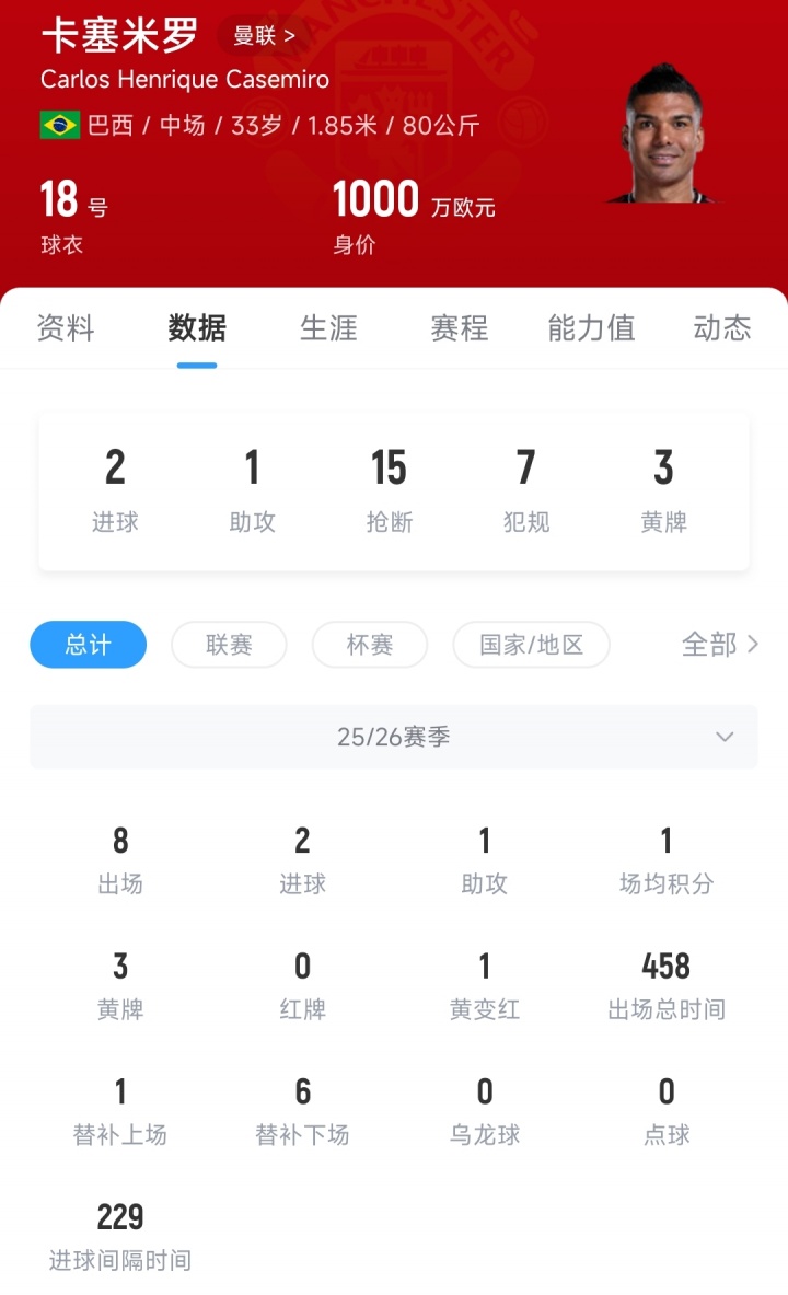 本赛季卡塞米罗行为曼联的主力后腰,出战8场比赛共458分钟,孝敬2粒进球和1次助攻。卡塞米罗在场的技能内,曼联仅丢掉3球,而卡塞米罗不在场的技能内,曼联丢掉了13球。