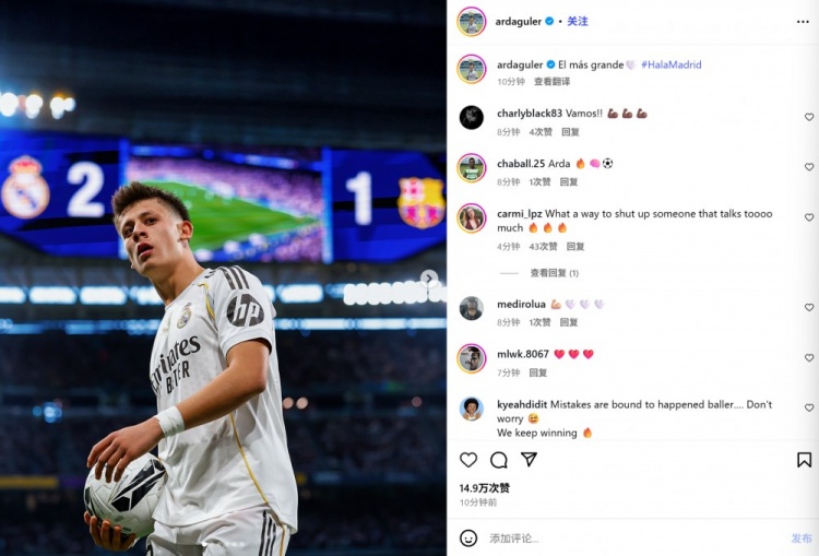 他也在赛后通过社媒晒出我方的比赛照,并配文:“最伟大的爱,马德里前进!”