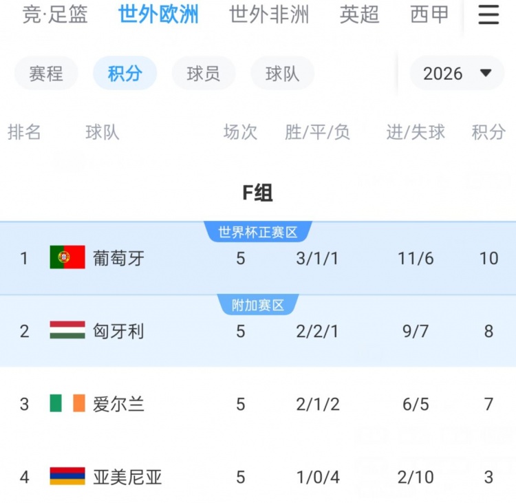 世初赛欧洲区小组赛F组现在的积分地点如下: