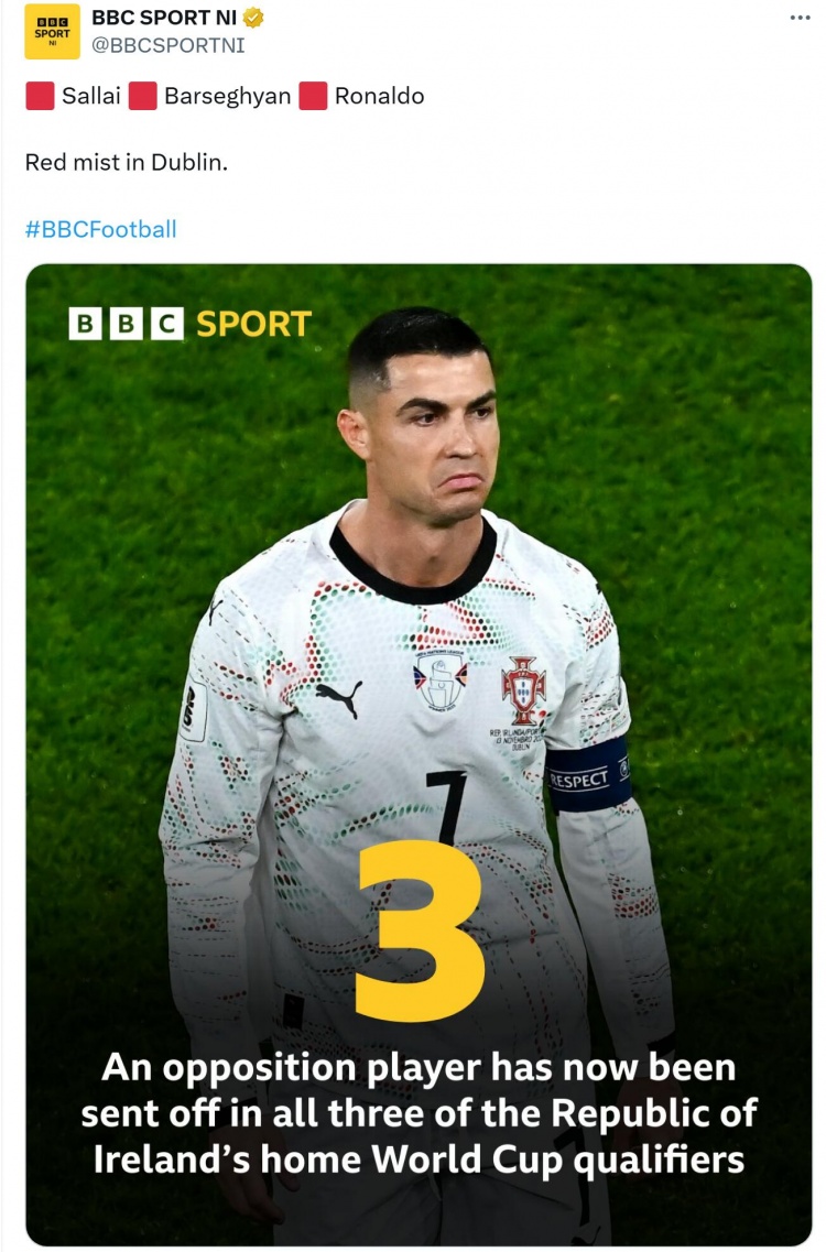 爱尔兰本届世初赛三个主场齐有对方球员拿红牌,C罗是其中第三东谈主