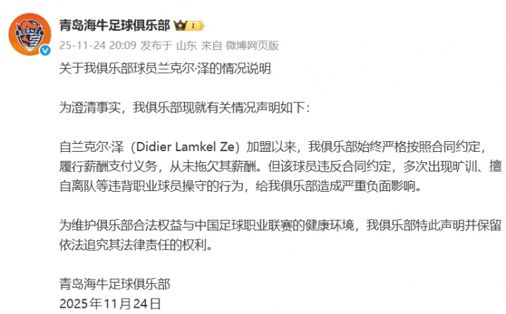 11月24日讯 针对球员兰克尔·泽指控拖欠工资,以偏握他一系列风云,青岛海牛发布了官方阐明。