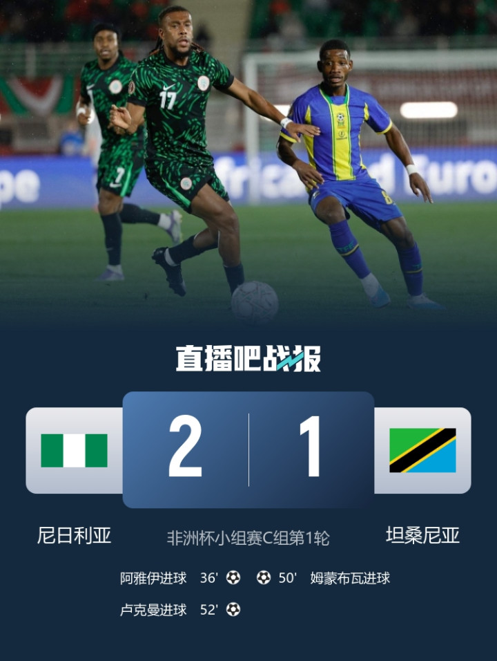 伊沃比助攻双响,卢克曼远射破门,尼日利亚2-1打败坦桑尼亚。