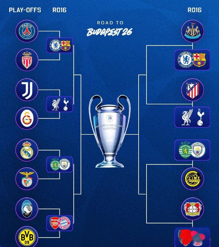 纽卡斯尔联将在16强赛事面对切尔西或巴萨,马德里竞技将面对利物浦或热刺,博德闪耀将面对葡萄牙体育或曼城,勒沃库森将面对阿森纳或拜仁。