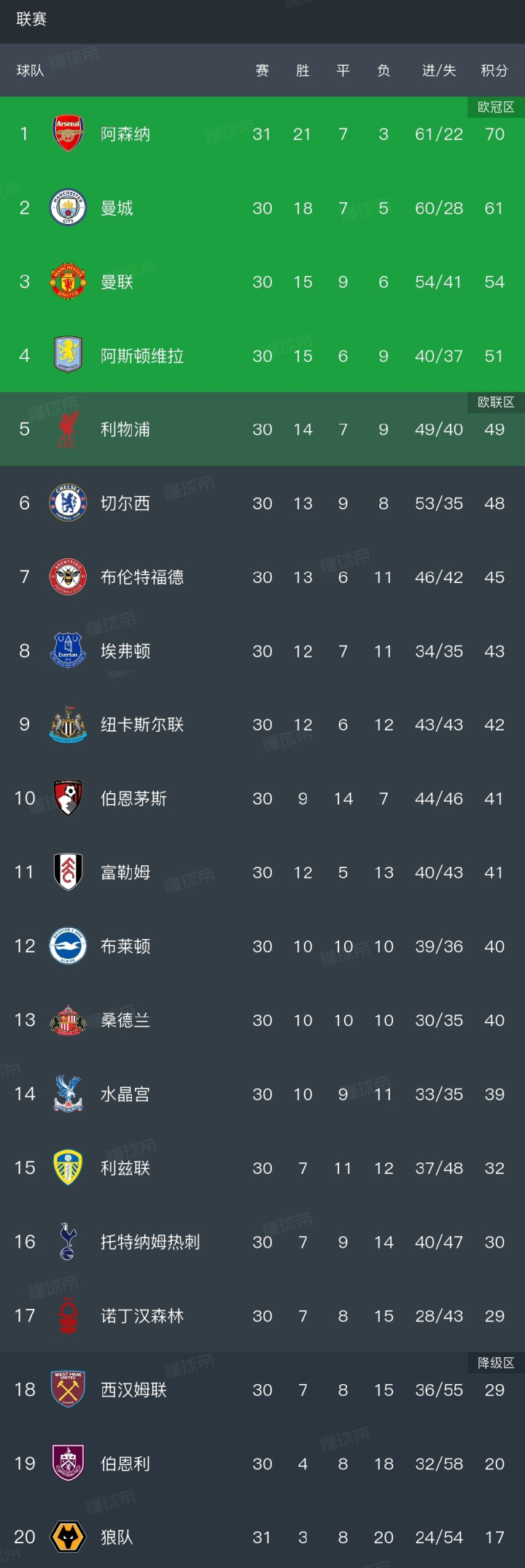 阿森纳积70分排在第一位。