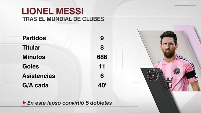 ESPN统计标明,自世俱杯之后,梅西投入9场比赛,其中8次首发,出场时辰686分钟,打进11球,送出6个助攻,平均每40分钟造1球。