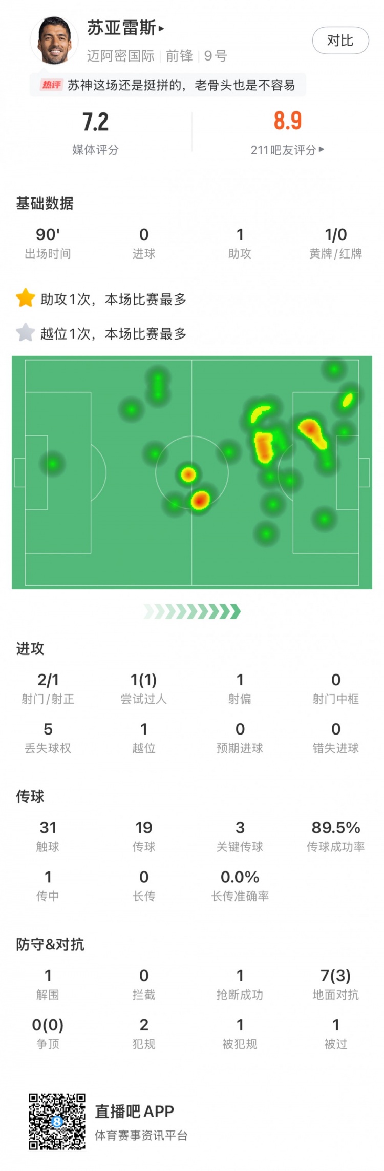 苏亚雷斯全场数据:3次环节传球、1次助攻、5次失球权,获评7.2分