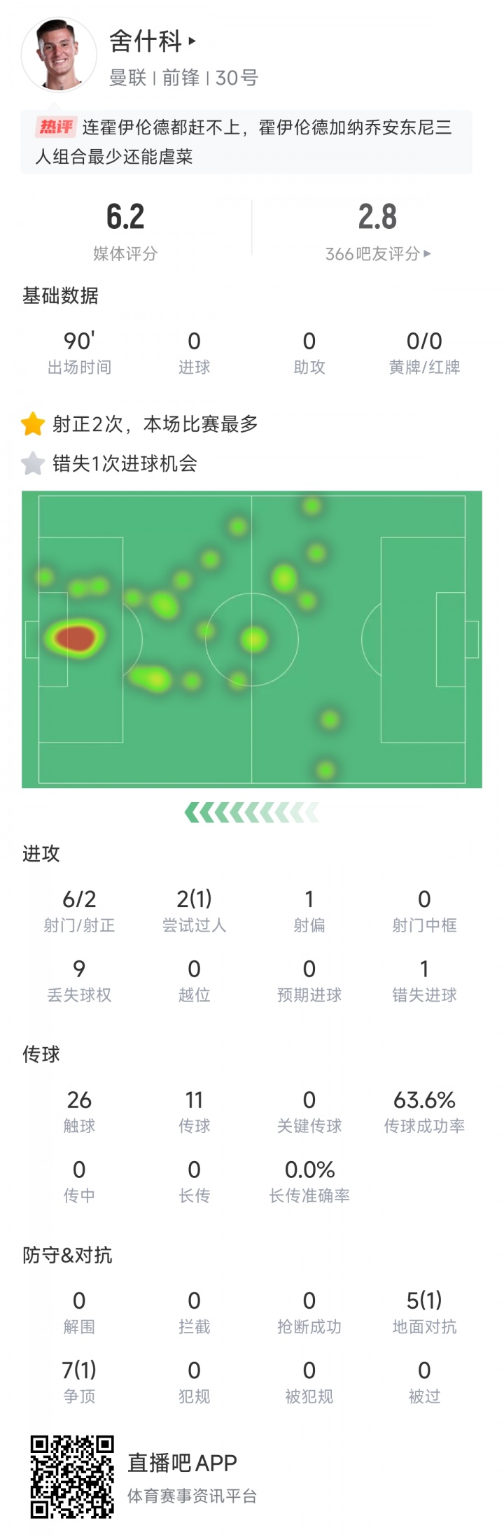 8500万中锋…22岁舍什科152分钟0球0助 踢英乙12回击2得手&失绝杀