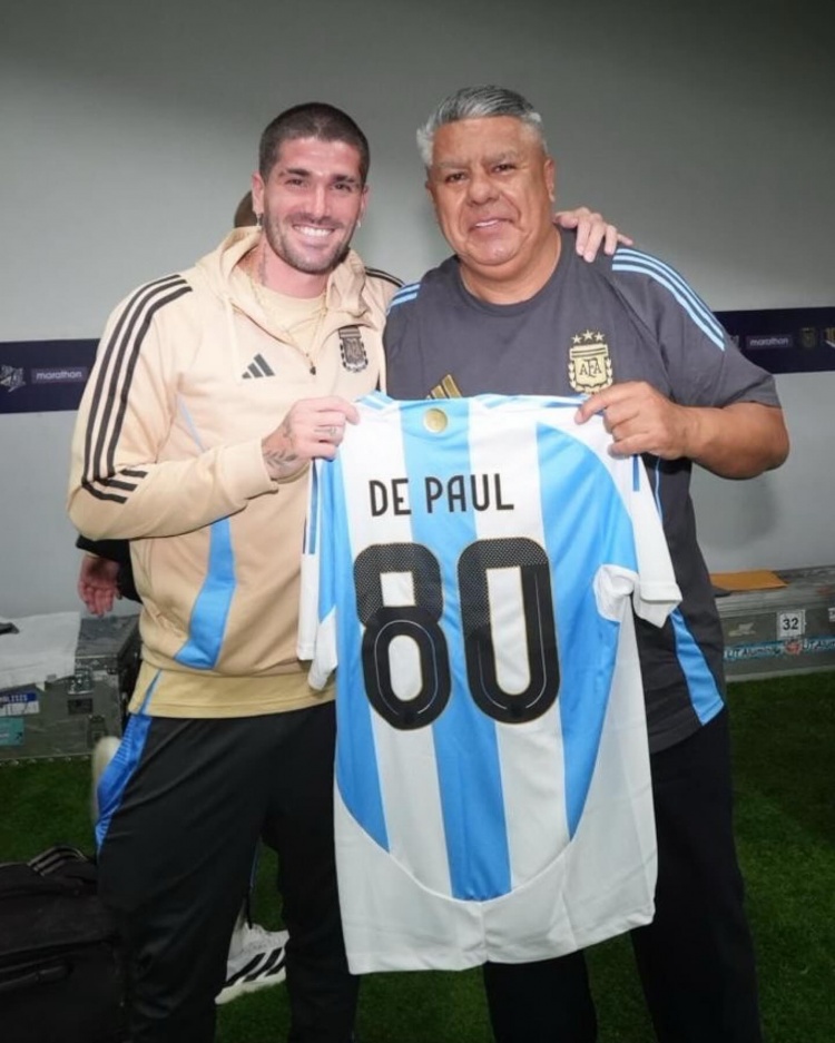 阿根廷足协主席塔皮亚赛后向德保罗颁发缅念念球衣,祝愿他竣事里程碑。