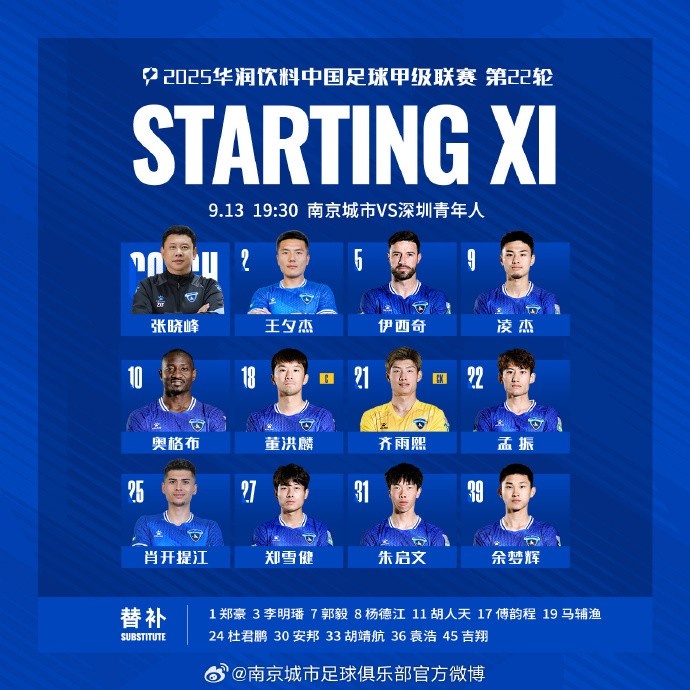 2025华润饮料中甲联赛第22轮,南京城市VS深圳后生东谈主 首发名单出炉,让咱们并肩作战!