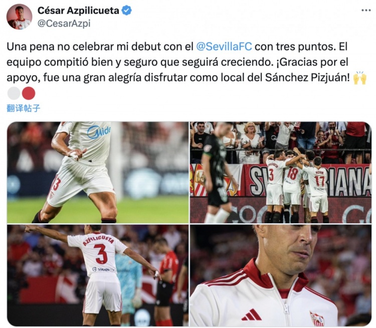 9月13日讯 西甲第4轮塞维利亚主场2-2战平埃尔切,本场比赛宿将阿兹皮利奎塔首发登场完成加盟后的首秀,球员赛后更新酬酢媒体。