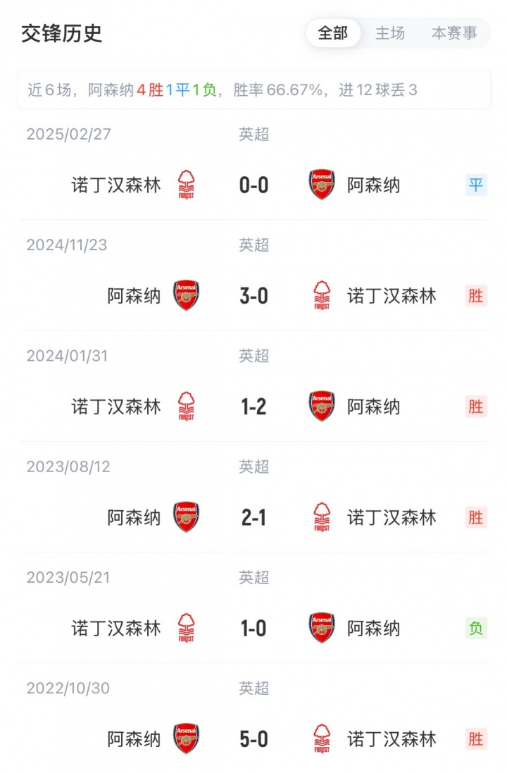 各项赛事中,阿森纳最近6次主场对阵诺丁汉丛林得回全胜,总比分为19-2。
