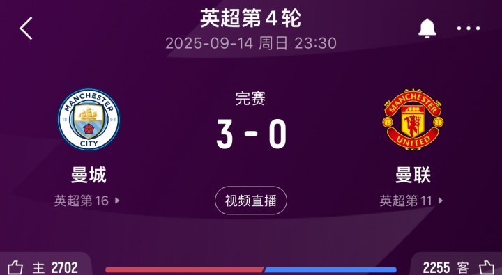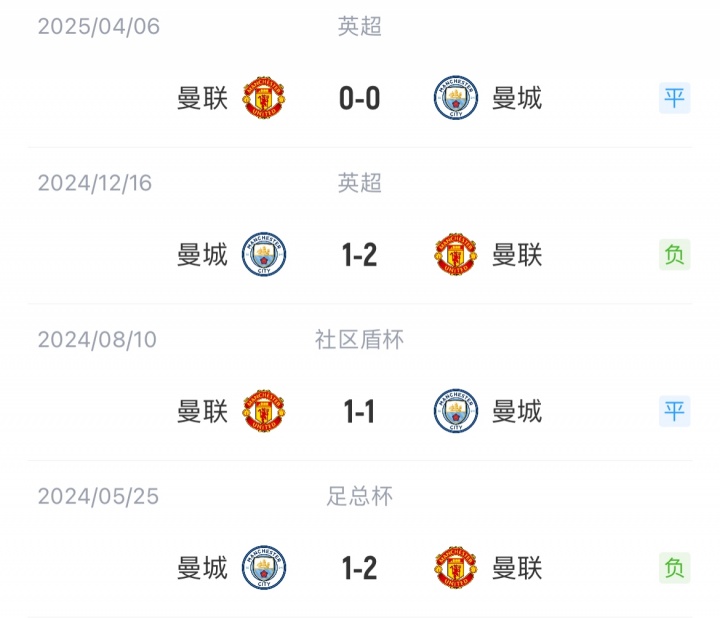 09月15日讯 英超第4轮曼城3-0投诚曼联,曼城也赢得了近5场曼市德比的初度收效,此前4场曼城已际遇2负2平!